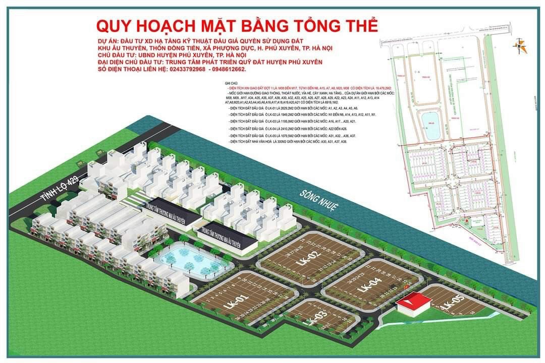 Lô đất LK01-2 thuộc khu đấu giá Âu Thuyền, thôn Đồng Tiến, xã Phượng Dực, huyện Phú Xuyên, Hà Nội. Đây là khu vực đang phát triển nhanh về hạ tầng và dân cư, nằm ở vị trí trung tâm xã, kết nối dễ dàng với các trục giao thông lớn.