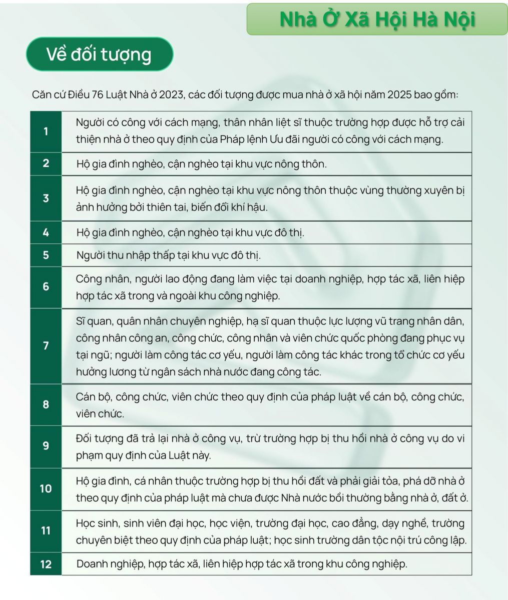 Căn cứ Luật Nhà ở 2023, các đối tượng đủ điều kiện mua nhà ở xã hội tại Hà Nội năm 2026 bao gồm: