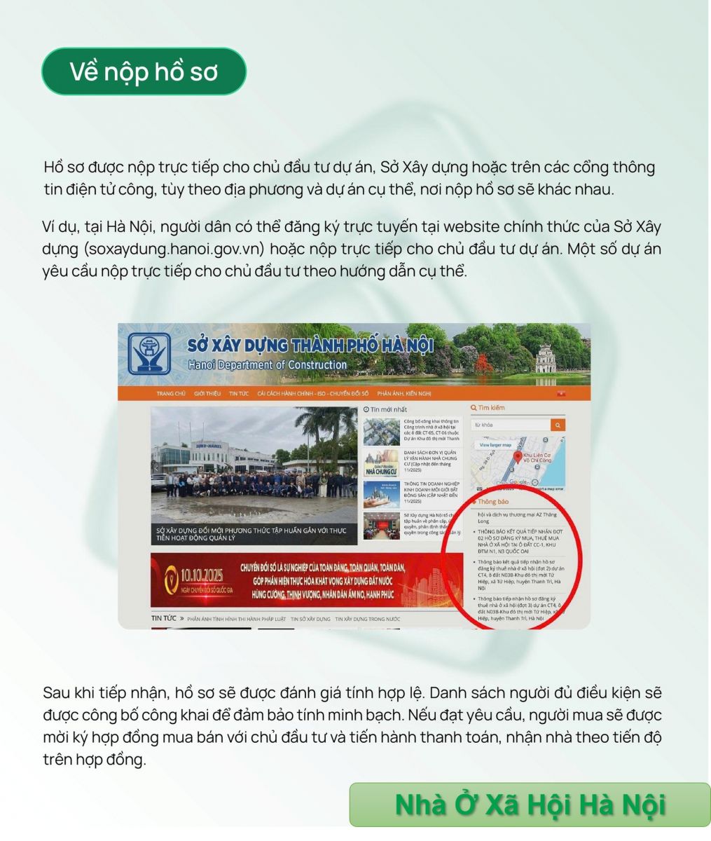 Sau khi tiếp nhận, hồ sơ sẽ được rà soát, đánh giá và công bố danh sách đủ điều kiện mua nhà ở xã hội theo quy định. Người đủ điều kiện sẽ được mời ký hợp đồng mua bán và thanh toán theo tiến độ dự án.