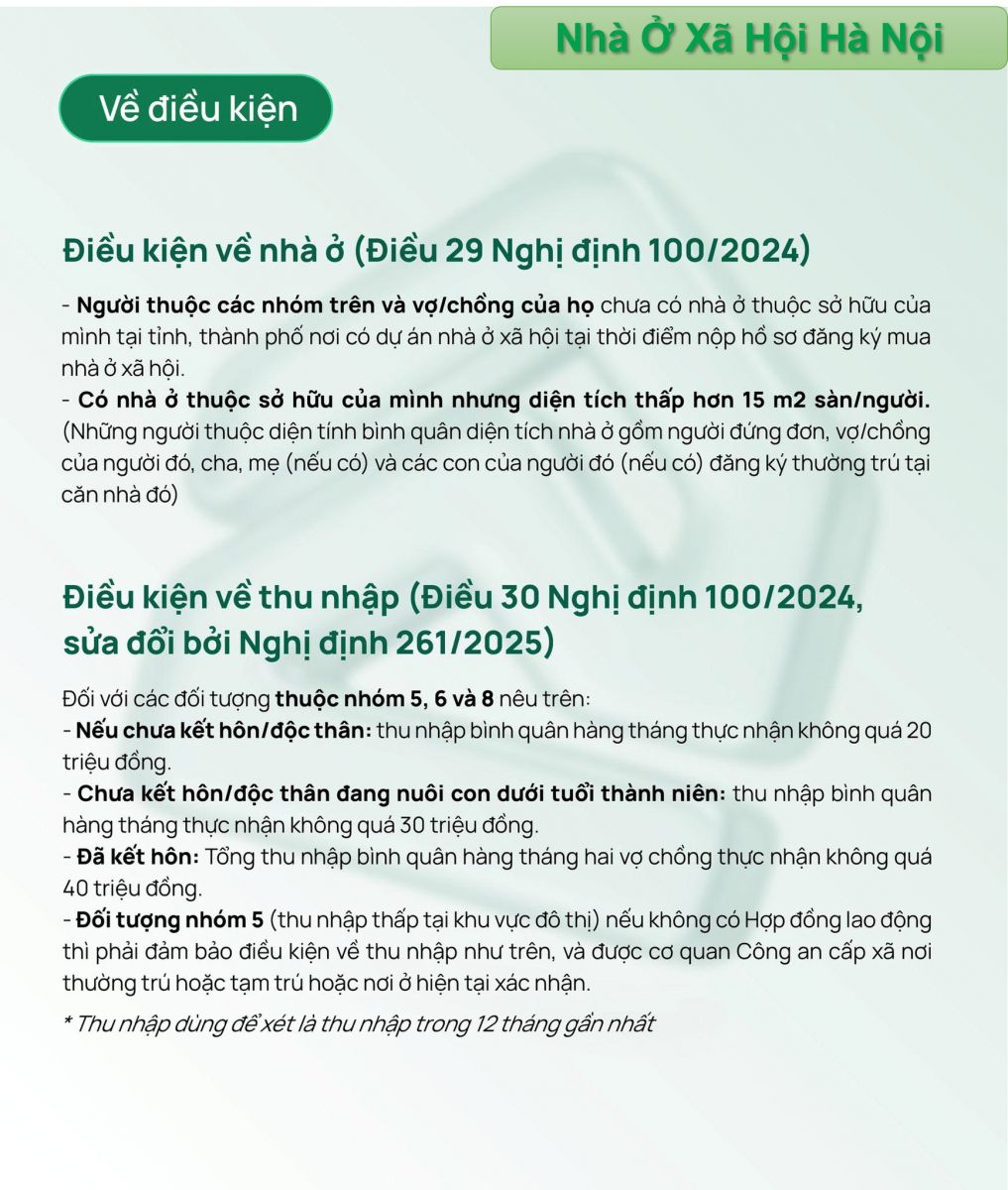 Theo Nghị định 100/2024/NĐ-CP, người mua nhà ở xã hội tại Hà Nội năm 2026 phải đáp ứng một trong các điều kiện sau: