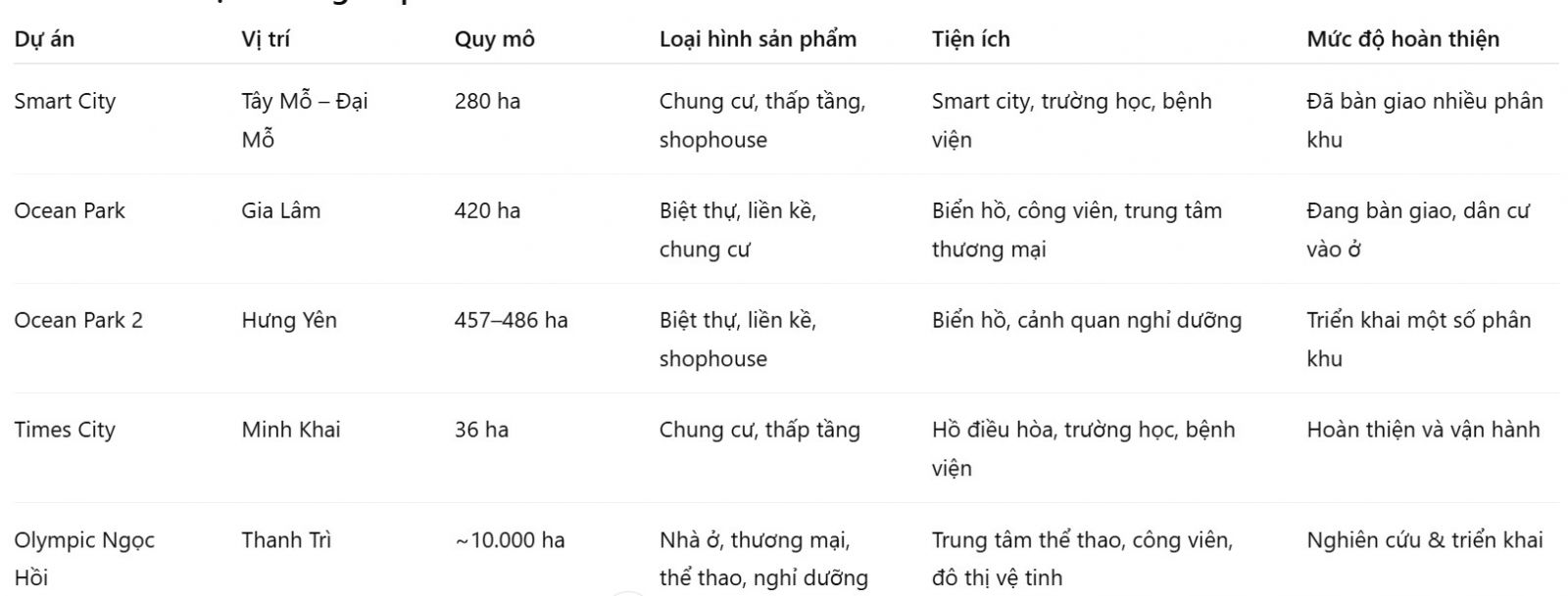 Dự án đã hoàn thiện như Times City, Smart City và Ocean Park 1 thích hợp để đầu tư an toàn, có dòng tiền cho thuê và thanh khoản tốt.