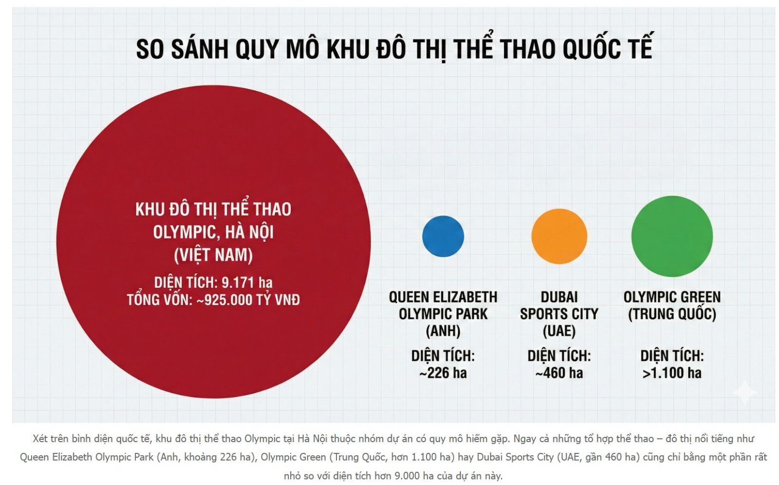 Để dễ hình dung, diện tích VinOlympic Hà Nội tương đương tổng diện tích các quận Ba Đình, Hoàn Kiếm, Đống Đa, Hai Bà Trưng, Tây Hồ, Cầu Giấy và Thanh Xuân (trước sáp nhập).