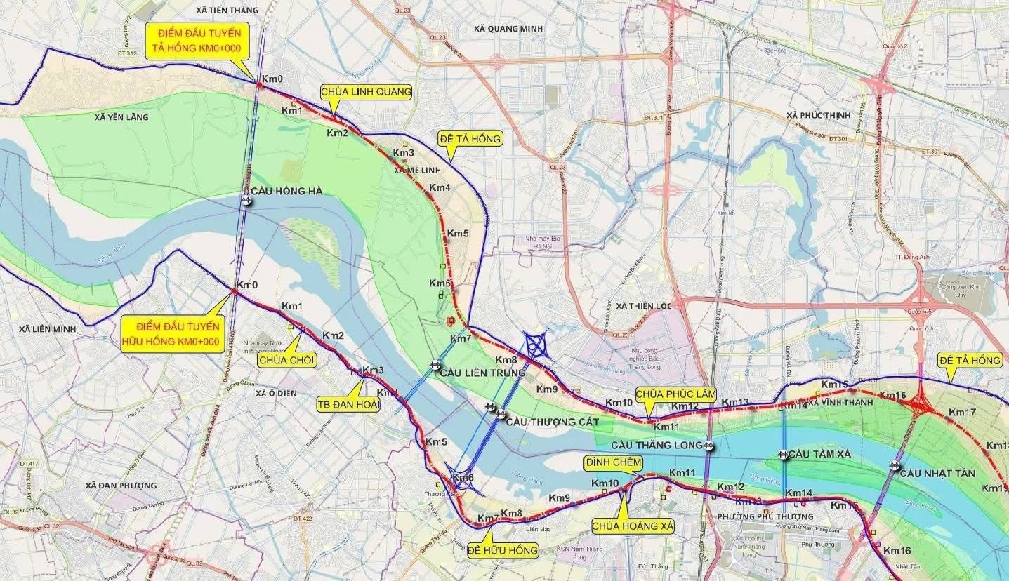 Bản đồ tuyến Trục Đại lộ Cảnh quan sông Hồng từ cầu Hồng Hà đến cầu Mễ Sở cho thấy đây là một dự án có quy mô rất lớn, phạm vi ảnh hưởng rộng và tác động sâu sắc đến không gian đô thị Hà Nội trong tương lai. Khi dự án được triển khai đồng bộ, trục đại lộ này không chỉ cải thiện hạ tầng giao thông mà còn mở ra dư địa phát triển mới cho các khu đô thị, công viên và bất động sản ven sông Hồng.